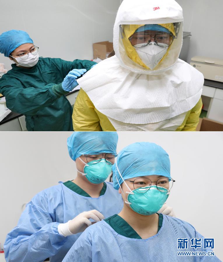 這張拼版照片顯示的是:2月25日,江蘇省南通市疾控中心病原微生物實(shí)驗(yàn)室的檢測人員郭陳(左)在清潔區(qū)幫助丈夫季霄雷穿防護(hù)服、戴正壓面罩(上);4月26日,季霄雷(左)幫助郭陳穿防護(hù)服(下)?!拔逡弧鼻跋?,江蘇省南通市疾控中心病原微生物實(shí)驗(yàn)室檢測組的90后黨員季霄雷和妻子郭陳以及其他同事依然堅(jiān)守在疫情防控第一線。 新華社發(fā)(許叢軍 攝)