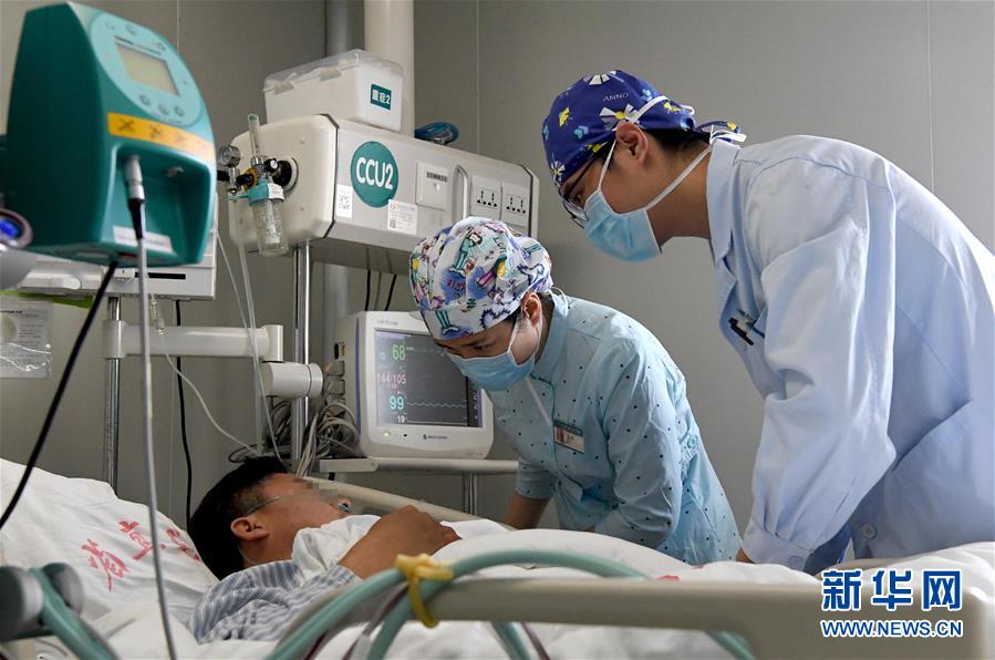 劉光耀(右一)和喬冰(右二)在河南省直第三人民醫(yī)院急重癥醫(yī)學(xué)中心病房內(nèi)詢問病人情況(4月26日攝)。劉光耀和喬冰是河南省直第三人民醫(yī)院急重癥醫(yī)學(xué)中心的護(hù)士,也是一對“90后”情侶。新冠肺炎疫情發(fā)生后,他們一起報名申請到武漢一線支援。新華社記者李安攝