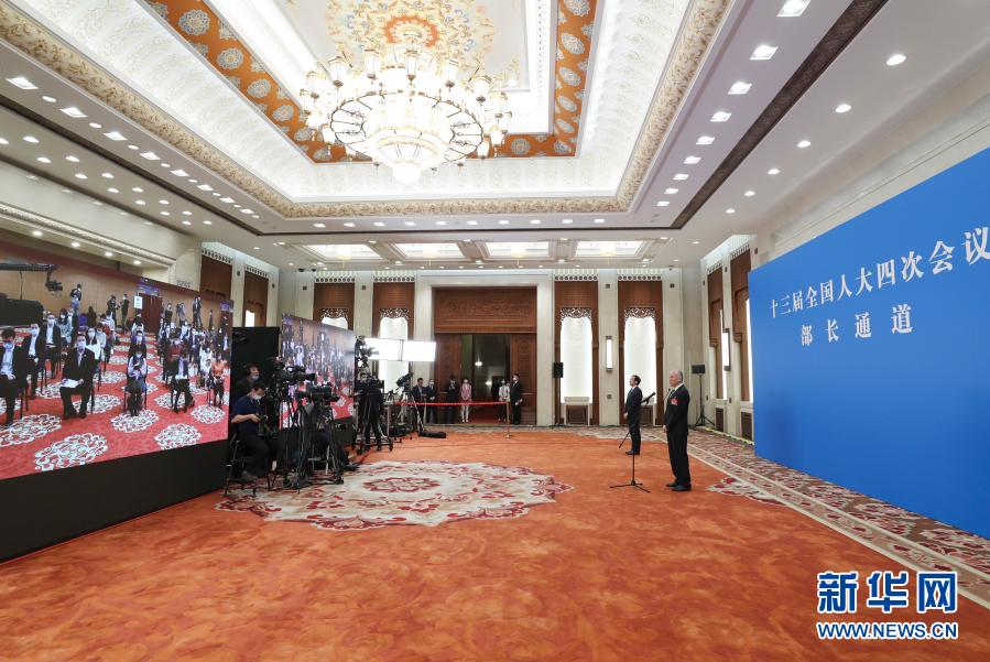 3月8日,第十三屆全國人民代表大會第四次會議舉行第二場“部長通道”采訪活動。這是商務(wù)部部長王文濤(右)通過網(wǎng)絡(luò)視頻方式接受采訪。