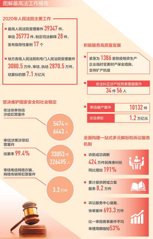 2020年,人民法院堅定不移貫徹新發(fā)展理念,緊扣全面建成小康社會目標(biāo)任務(wù)依法履職盡責(zé),審結(jié)一審民商事案件1330.6萬件、行政案件26.6萬件,積極服務(wù)構(gòu)建新發(fā)展格局、推動高質(zhì)量發(fā)展。