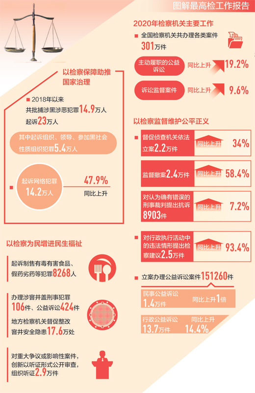 2020年,刑事檢察更加有力,民事檢察更為精準(zhǔn),行政檢察持續(xù)做實,公益訴訟檢察有序拓展,檢察機關(guān)在嚴(yán)格依法履職中促進社會公平正義。