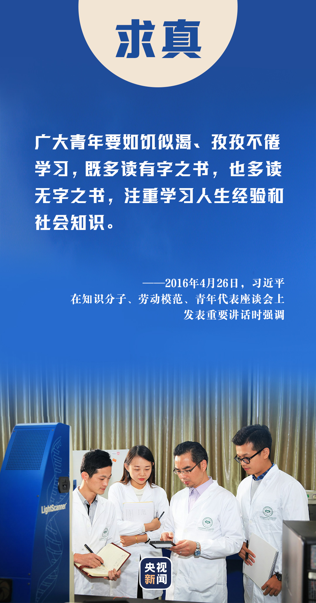 2013年五四青年節(jié),習(xí)近平總書記來到中國航天科技集團(tuán)公司中國空間技術(shù)研究院,與青年代表座談??倳浿赋觯瑥V大青年要堅持面向現(xiàn)代化、面向世界、面向未來,增強知識更新的緊迫感,如饑似渴學(xué)習(xí),既扎實打牢基礎(chǔ)知識又及時更新知識,既刻苦鉆研理論又積極掌握技能,不斷提高與時代發(fā)展和事業(yè)要求相適應(yīng)的素質(zhì)和能力。