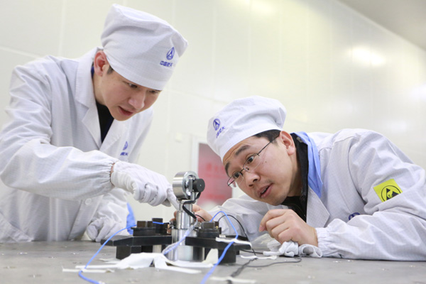 中國航天科技集團(tuán)公司的青年科研人員在做產(chǎn)品試驗。