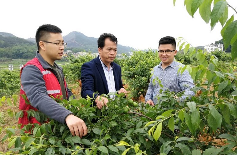 廣西馬山縣林圩鎮(zhèn)伏興村駐村第一書記周福波(左一)在查看村里已經(jīng)掛果的三華李。
