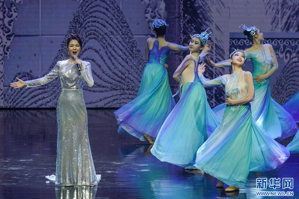 7月17日晚上,青年歌手佟雨軒(右)在演唱歌曲《追尋》(7月17日攝)。新華網(wǎng) 肖和勇 攝