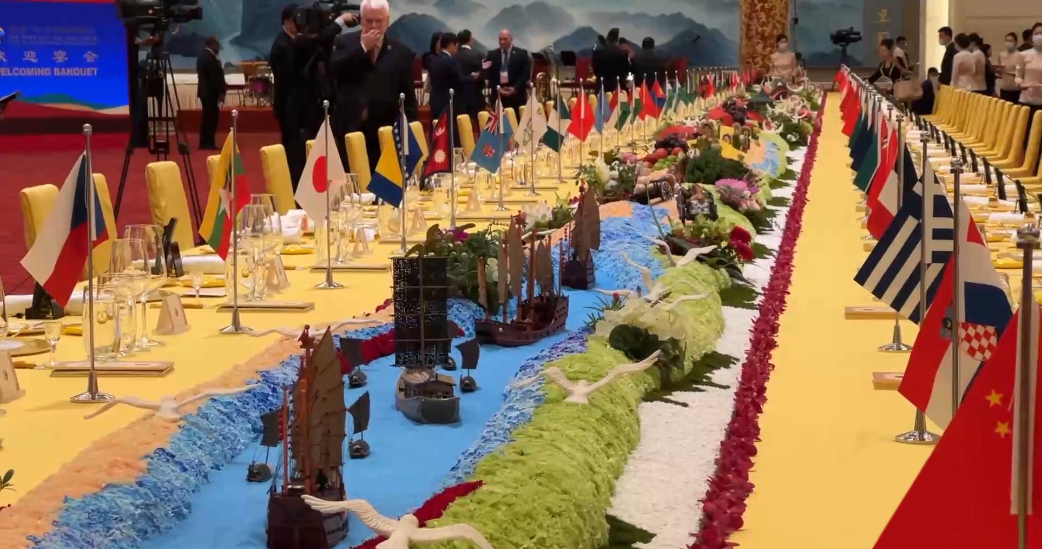 在10月17日晚舉行的歡迎宴會上,嘉賓們被這樣一個細(xì)節(jié)深深打動——晚宴餐臺以“撫古觀今、擁抱未來”為主題,南側(cè)展示著古代絲綢之路的微觀景象:海邊碼頭上擺放著對外出口的瓷器、絲綢、茶葉等貿(mào)易物資,路上擺放有從西域引進(jìn)的蔬菜瓜果;餐臺北側(cè)為21世紀(jì)絲綢之路的景觀:以北京天壇的裝飾為起點(diǎn),中間穿插高鐵、中歐班列、新能源汽車等擺件,展現(xiàn)各國互聯(lián)互通的景象……